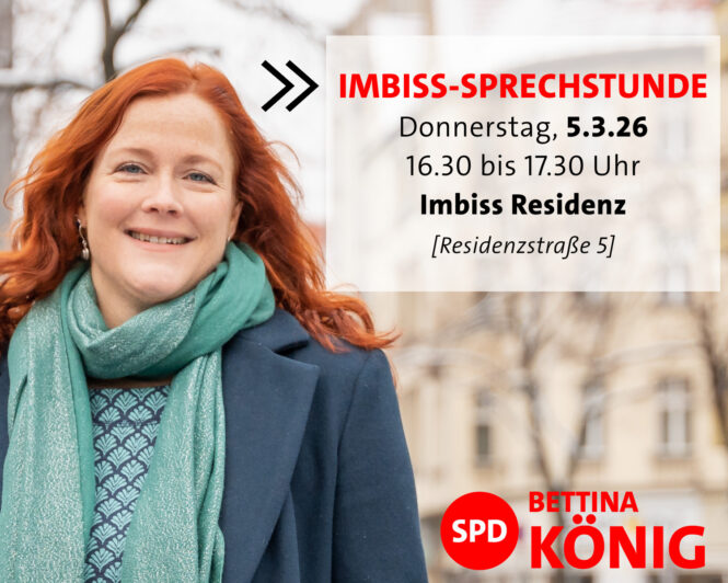 Sie möchten über ein Anliegen reden, haben einen Hinweis oder ein wichtiges Thema? Ich bin für Sie da! Kommen Sie zu meiner Imbiss-Sprechstunde am 5. März am Imbiss Residenz in der Residenzstraße 5 und lassen Sie uns in gemütlicher Atmosphäre reden. Ab 16.30 Uhr bin ich für Sie ansprechbar. Für eine bessere Planung bin ich Ihnen für eine kurze Anmeldung vorab unter info@bettina-koenig.de dankbar. Kommen Sie vorbei – ich freue mich auf Sie!